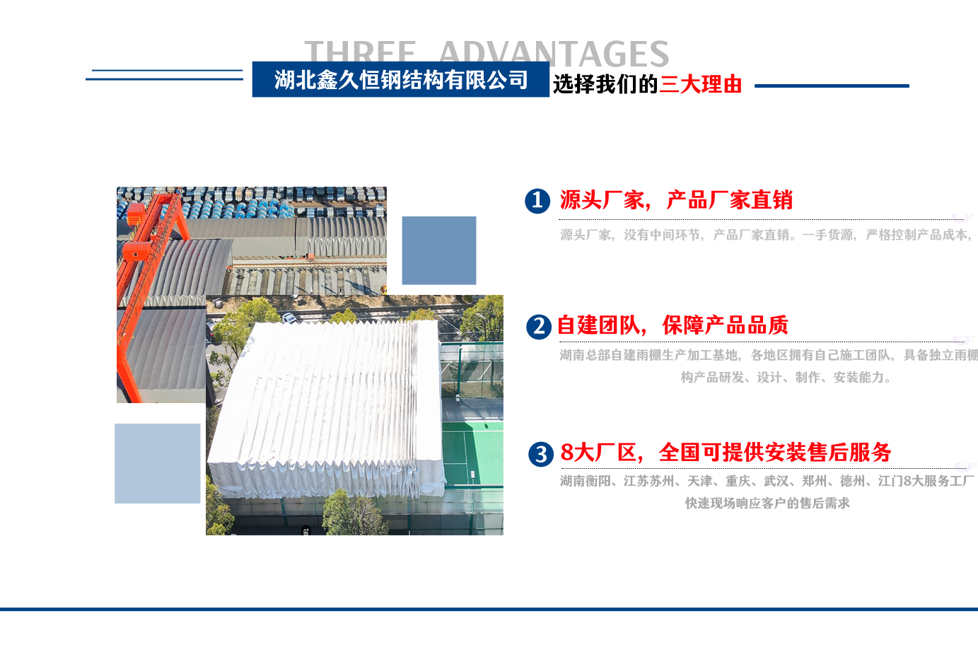 湖北鑫久恒鋼結構有限公司是一家電動雨棚、膜結構車棚研發,生產銷售,施工安裝于一體的專業鋼結構科技公司,主要產品有伸縮雨棚,電動雨棚,膜結構車棚等。  湖南地區職員目前有80多人,占地面積20000平方米,廠房面積15600平方米,配備先進的生產流水線,使每件品質產品的堅實基礎?! 」驹谔K州、天津、重慶、武漢、德州、烏魯木齊、江門均設有服務工廠,總人員共300多人,擁有專業的技術團隊,配備先進的設備和流水線生產,產能高,貨源充足,發貨速度快,服務區域廣?! ∫苿由炜s棚適用于通道臨時倉儲、戶外運動遮陽、污水池遮蓋、能源交通、熱力化工、礦山、船舶制造及市政建設、物流、碼頭等領域的構件制作加工,成品半成品存放、倉庫、野外儀器設備操作用房等。尤其是對工廠發貨、倉儲臨時遮雨防嗮,梅雨期較長、建設周期較短的工程施工等特別適用。還可根據用戶需求量身定制、適合企業所需不同款式的產品?! ∥夜緢猿帧罢\信社會為本,客戶滿意為榮”的經營理念,做到質量把控,嚴格管理,精益求精,恪守承諾。使鑫久恒逐步走向成熟,其系統化、專業化日趨完善。以專業的技術、科學的管理,更高的產品質量,優良的企業信譽,真誠的客戶服務,靈活多樣的經營方式和務實創新的企業精神愿與社會各界攜手合作,為推動智能鋼結構建筑事業的發展而不斷努力。...